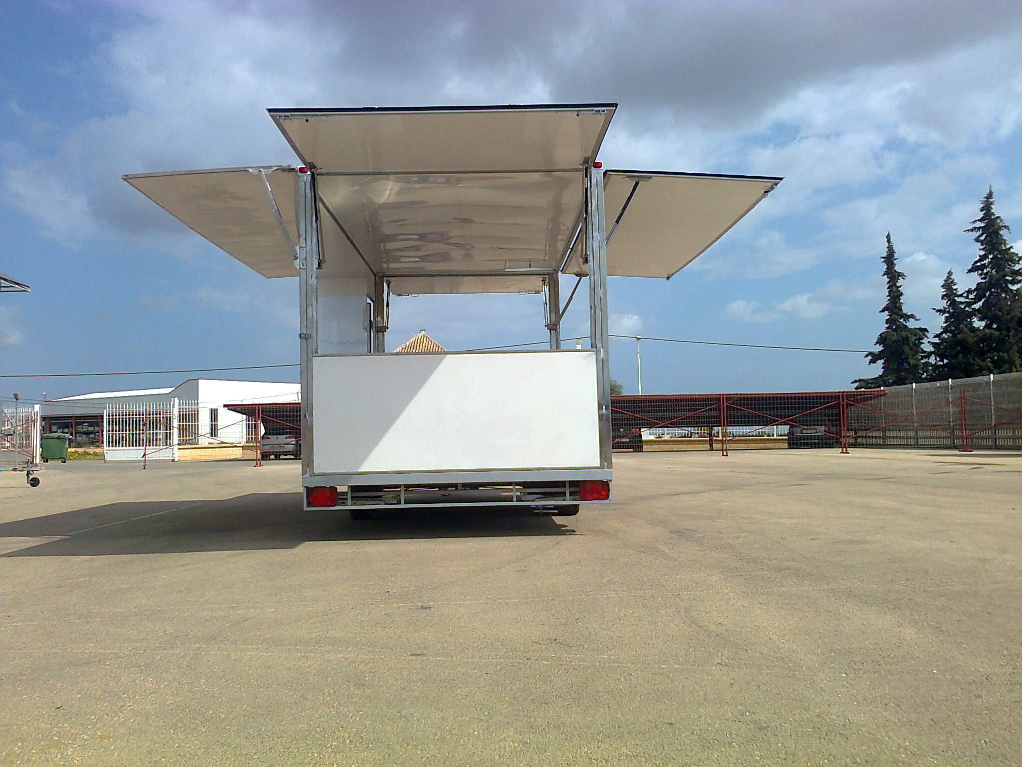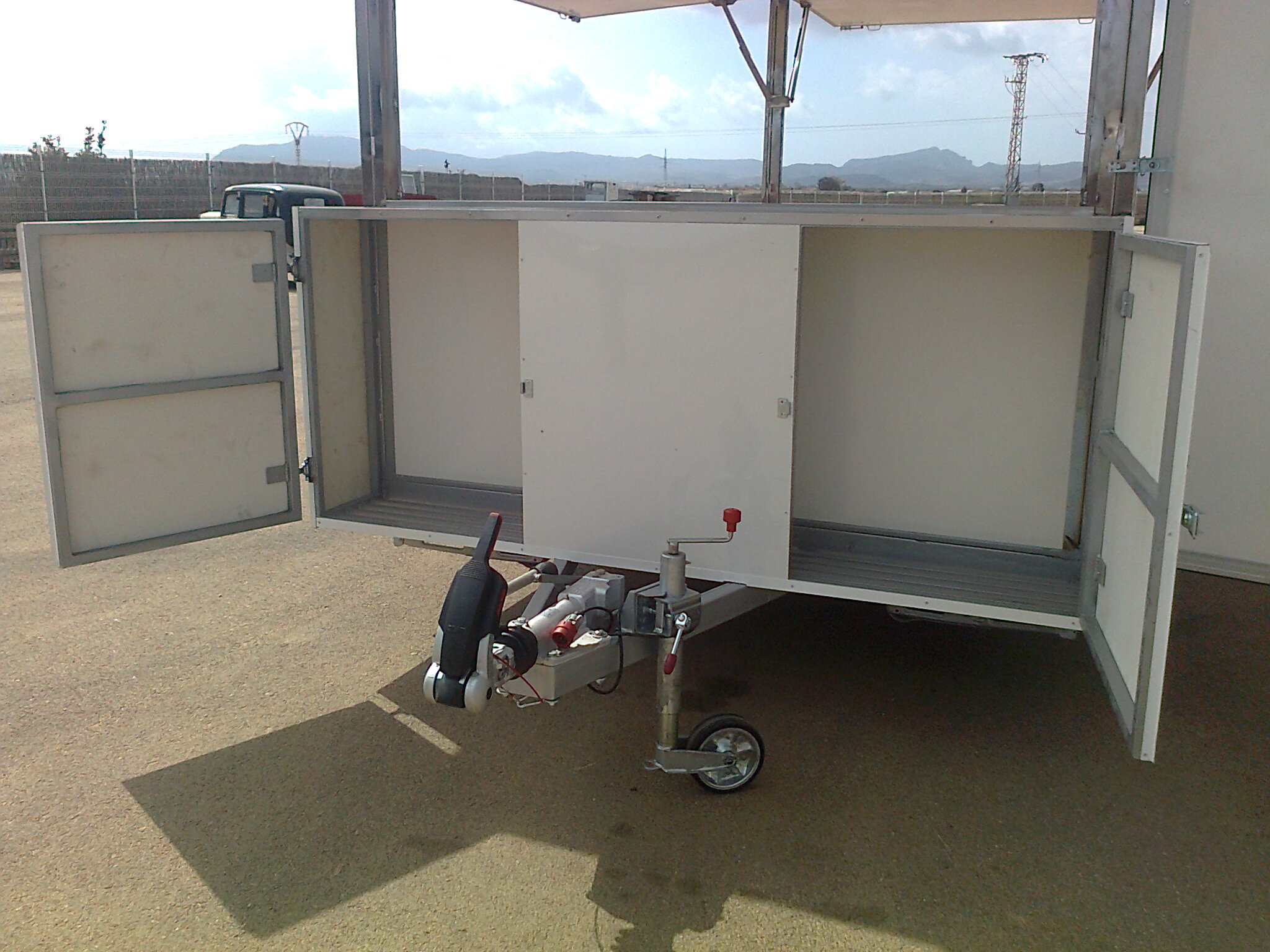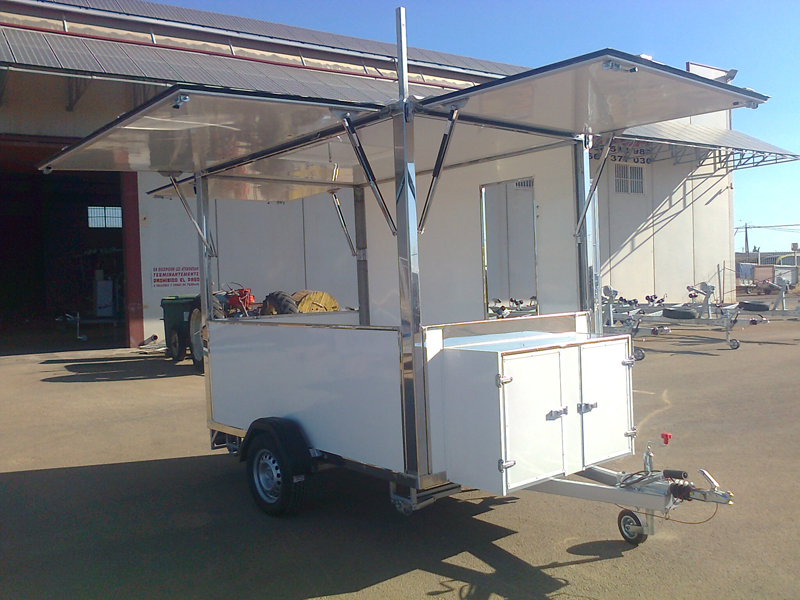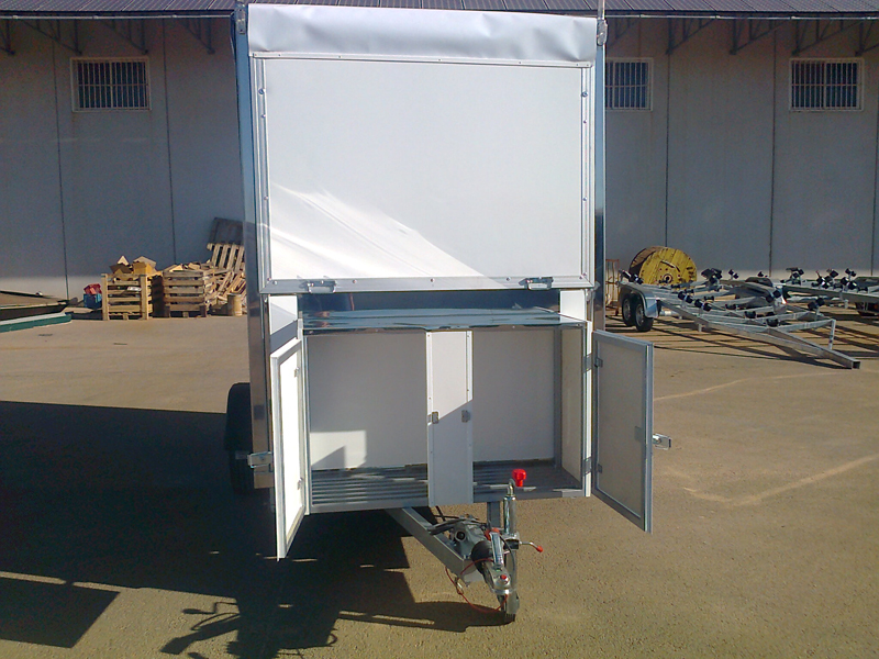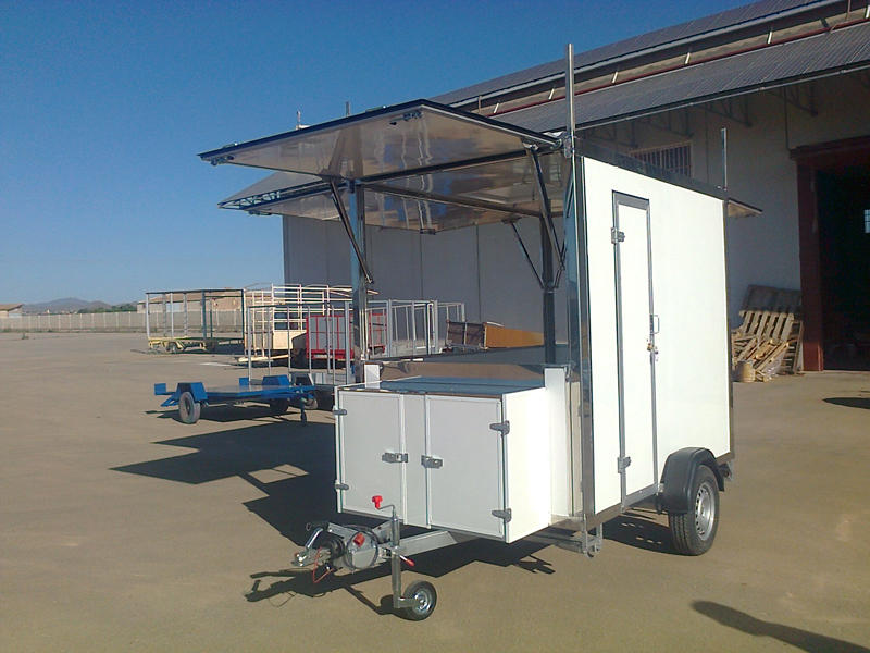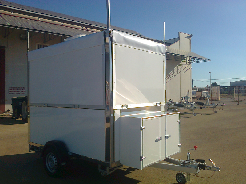 Remolques fabricados según las necesidades del cliente. Fabricado en panel sándwich o poliéster de uno o dos ejes. Incluye pilares y mostradores de acero inoxidable.